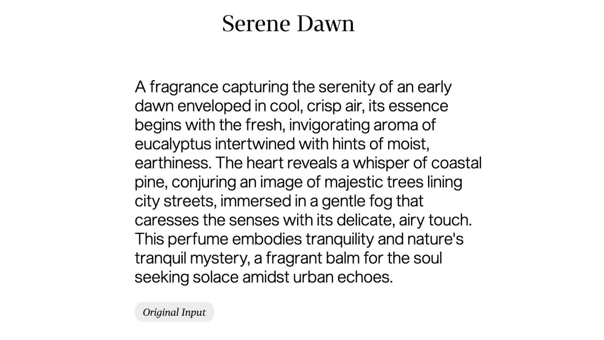 I’ve always wanted to create a perfume that represents the San Francisco Bay Area where I live. So I began by typing a brief paragraph describing the scene: a foggy morning in San Francisco. Here’s my input: