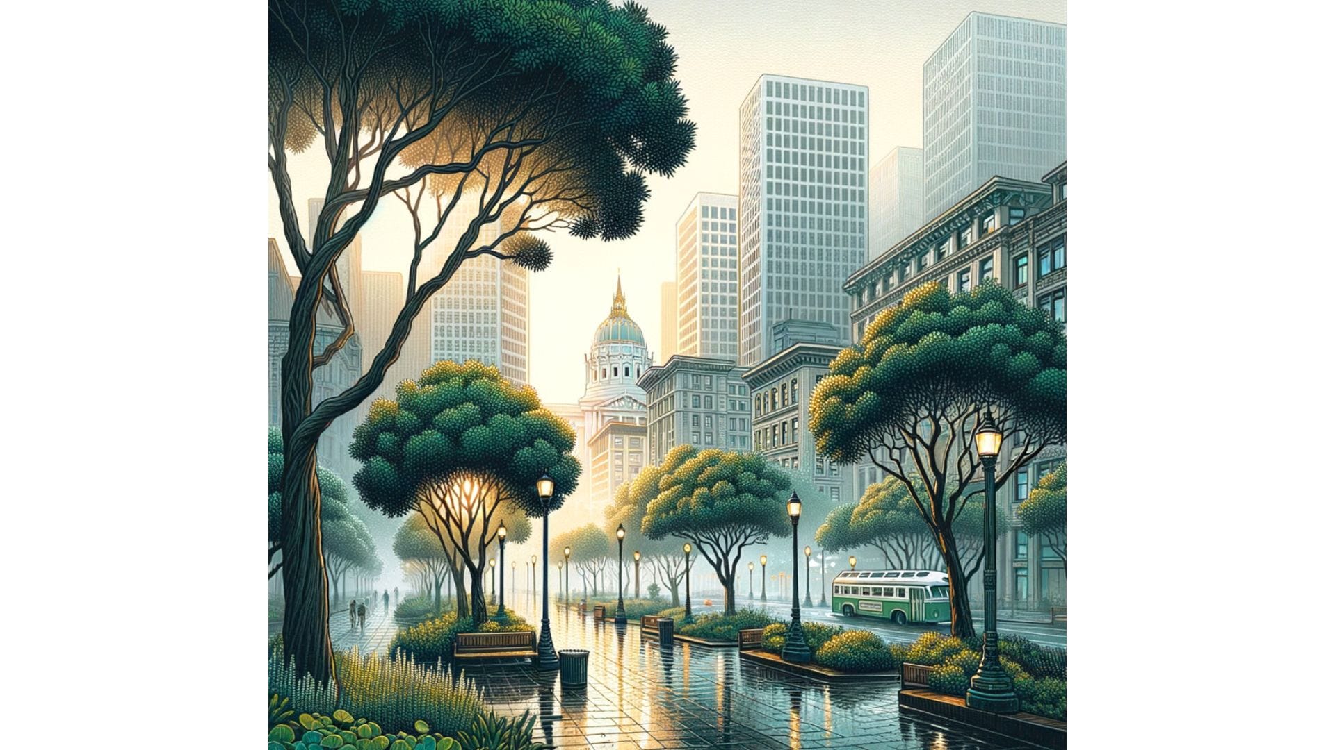 “In the early dawn, as fog rolls in to blanket the City, the air feels crisp and cool, but at the same time damp and earthy. The streets are lined with eucalyptus trees, interwoven with coastal pines.”