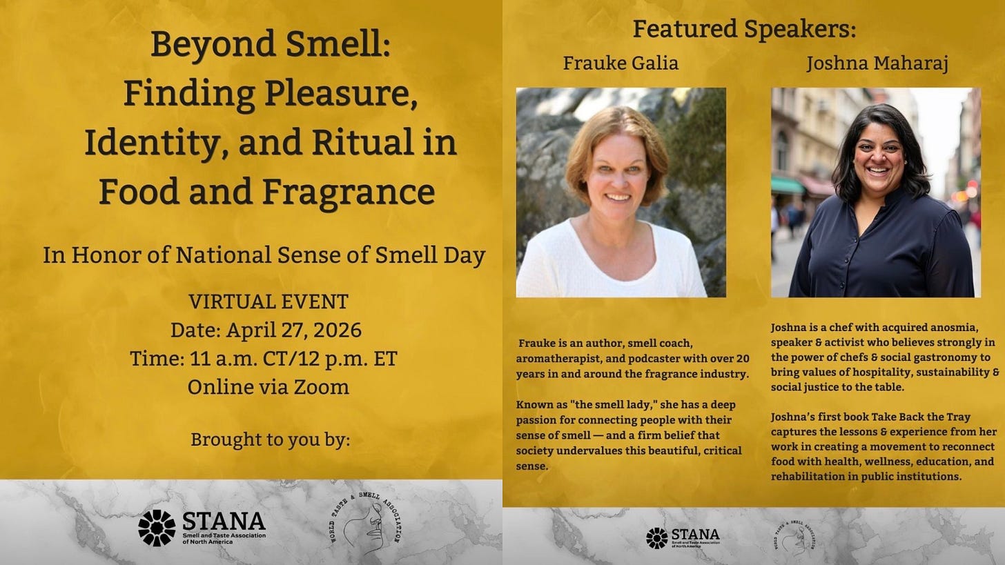 Participants will hear from Joshna Maharaj, author of "Take Back the Tray" and a chef with smell dysfunction, on how taste, texture, temperature, trigeminal sensations, visual cues, and emotional connection can shape enjoyment of food even without smell. Frauke Galia, of An Aromatic Life, will then explore how fragrance can remain meaningful through ritual, memory, aesthetics, trust, and personal identity, while also highlighting what the fragrance industry could do better for anosmic consumers.