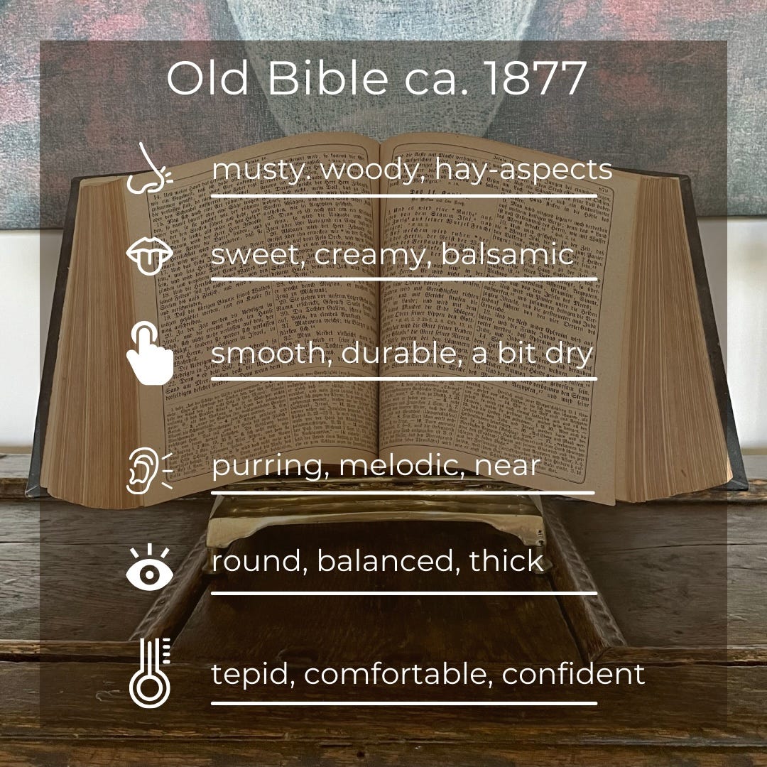 Another example is an old bible from 1877, which I smelled at my mother’s house. Here is how I would describe its smell: