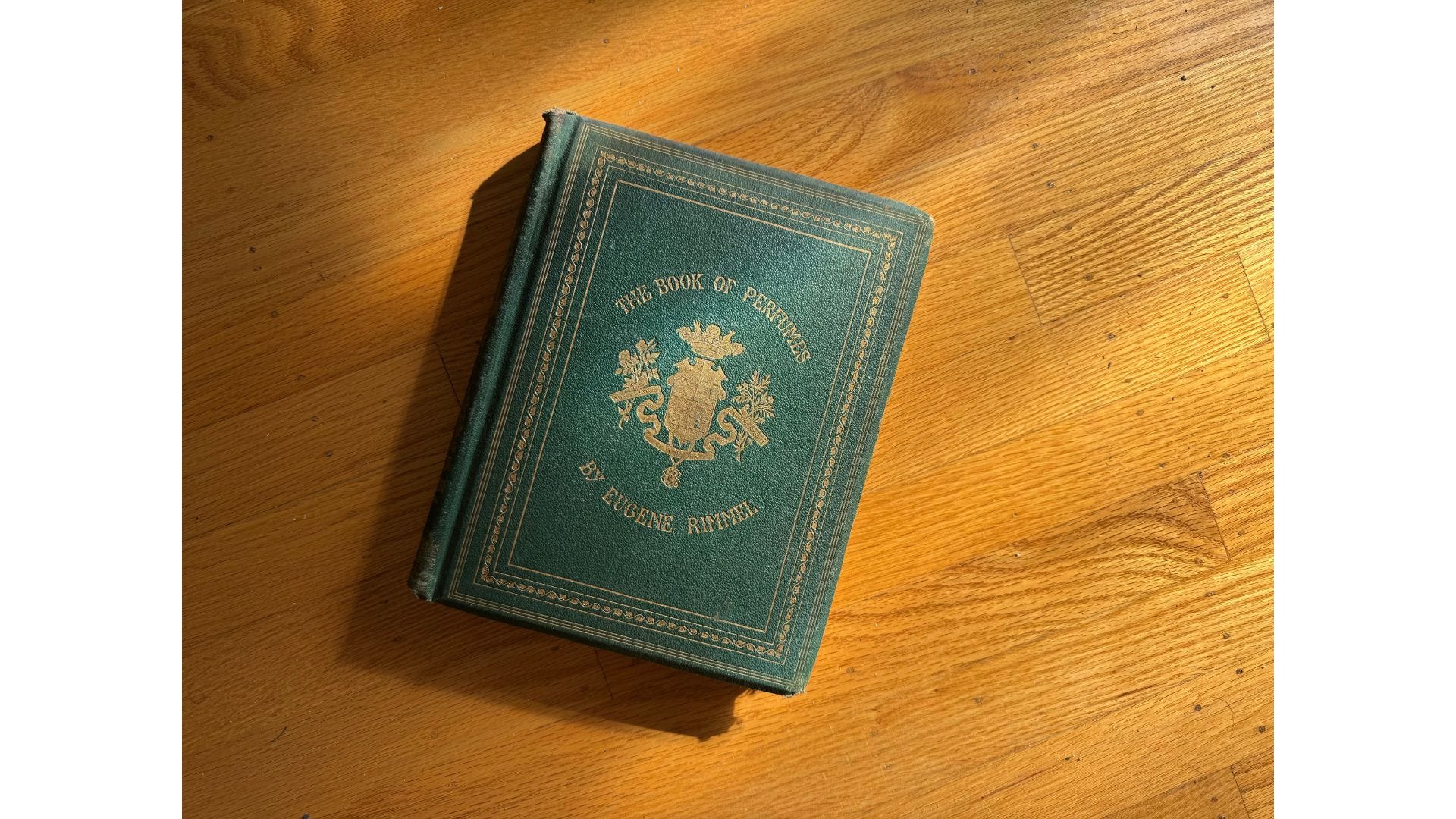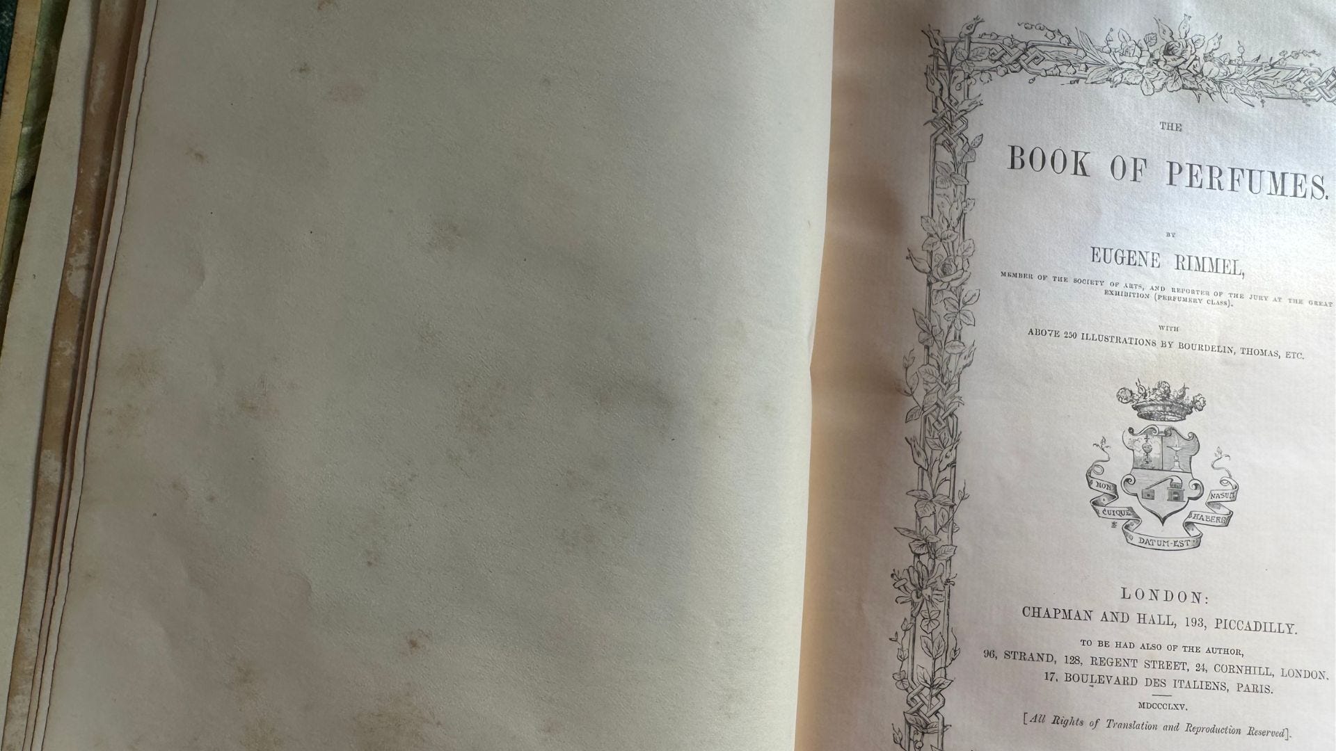 “The Book of Perfumes” (first edition) by British Perfumer Eugene Rimmel oozes a rich, musty, woody smell. I handle her with great care because the pages are quite brittle, but they smell so beautifully of the past.
