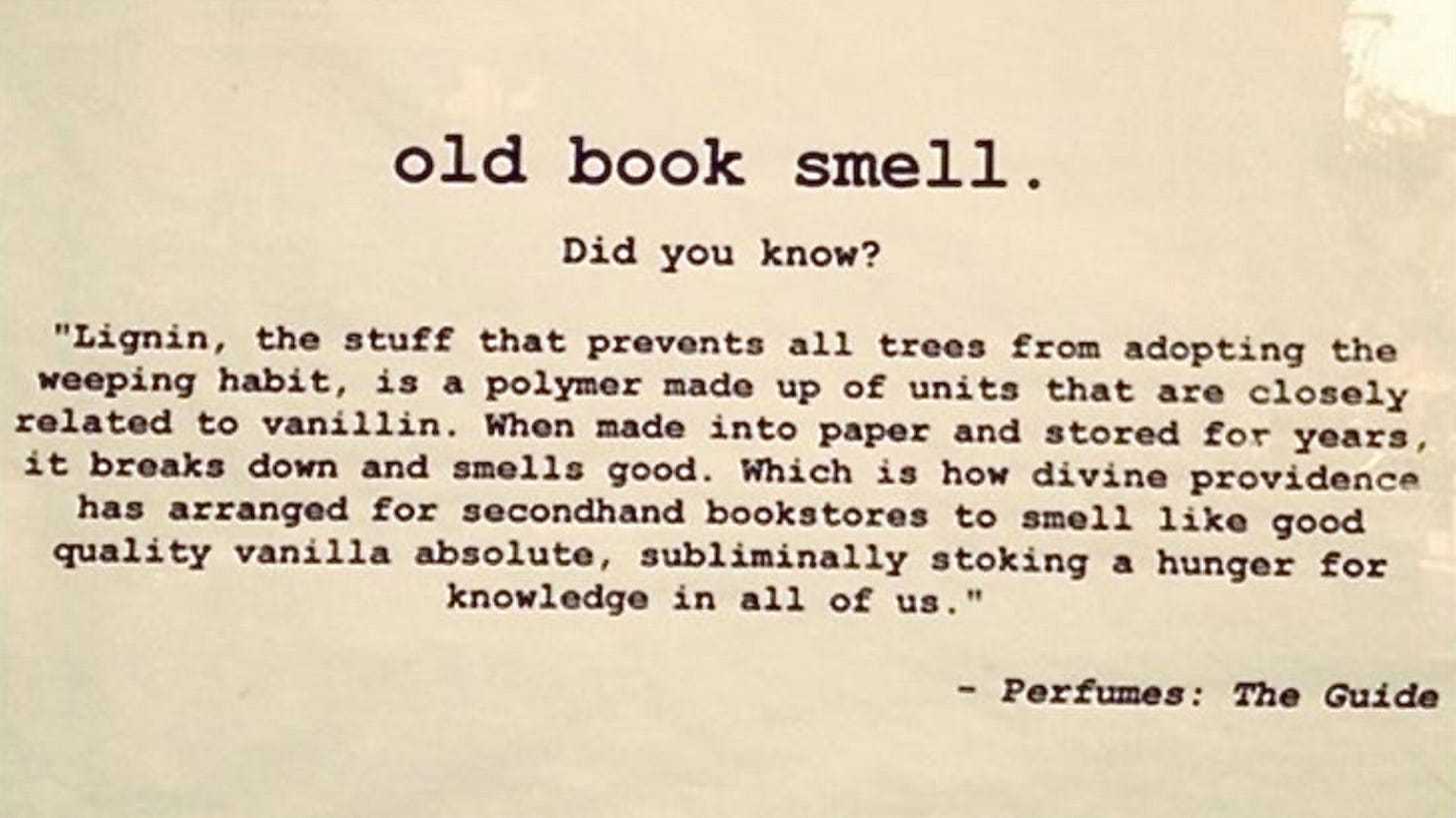 Without even reading a single word on the page, the smell of the book lets me know that what’s written is based on ideas from long ago. Smell gives me greater context and nuance which helps inform what I’ll read.